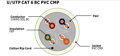 U/UTP CAT 6 FEP বিচ্ছিন্নতা এবং প্লেনাম জ্যাকেট নেটওয়ার্ক ক্যাবল সহ সলিড 0.57 মিমি তামা কন্ডাক্টর। বিশ্বব্যাপী বাজারের জন্য UL/ETL সার্টিফিকেশন সহ সিএমপি রেটেড।