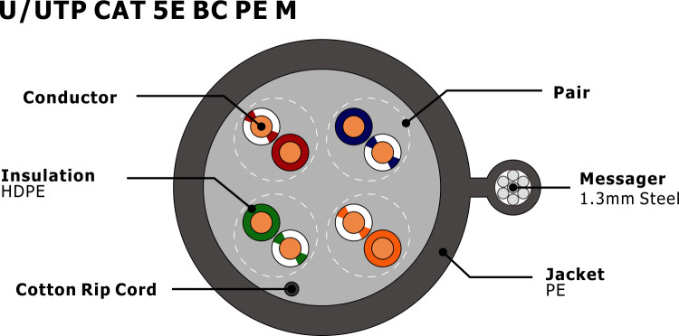 | ঝাল: | UTP, unshielded twisted pair | পণ্যের নাম: | মেসেঞ্জার সহ U/UTP CAT5E PE |